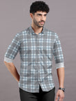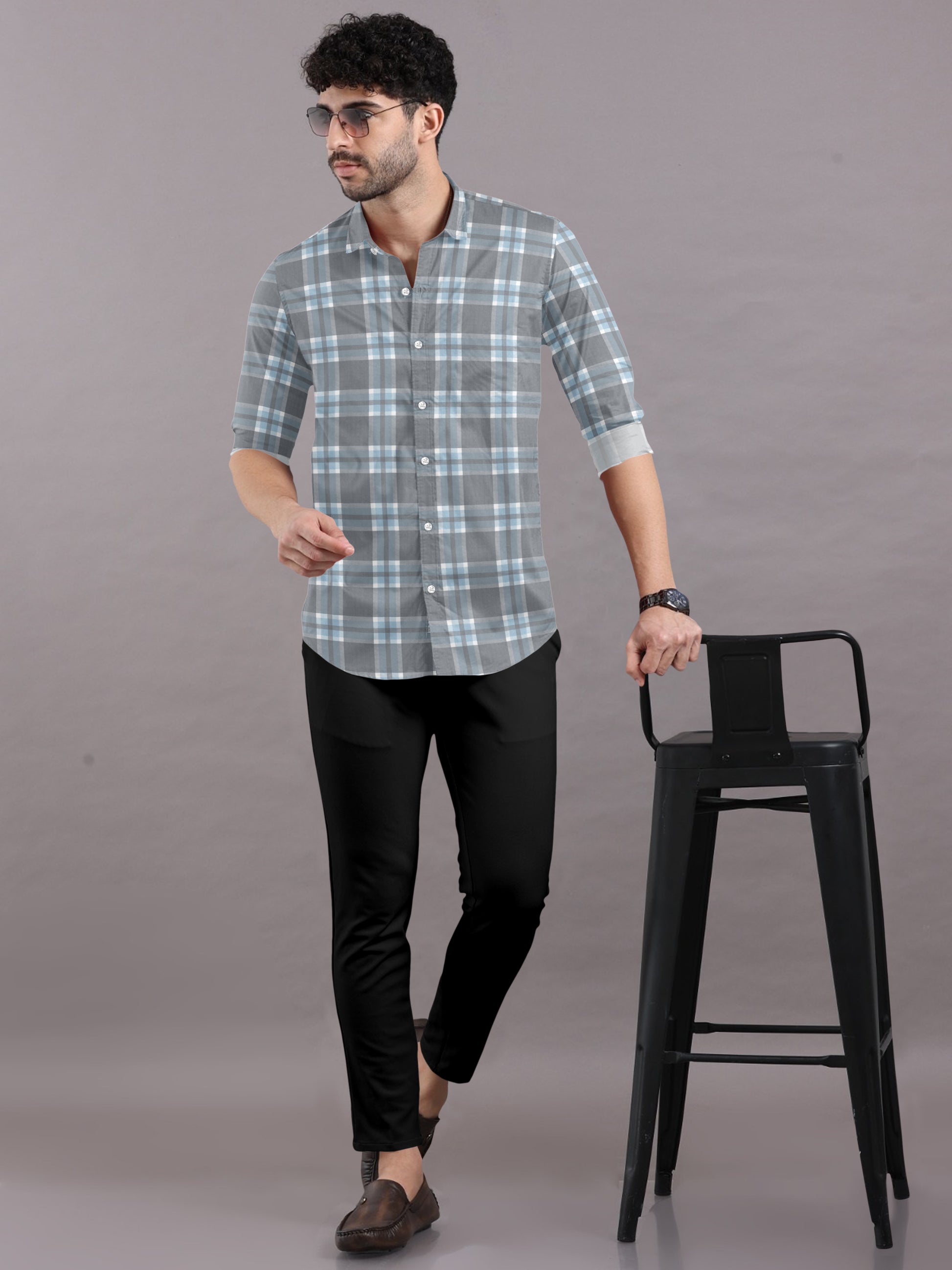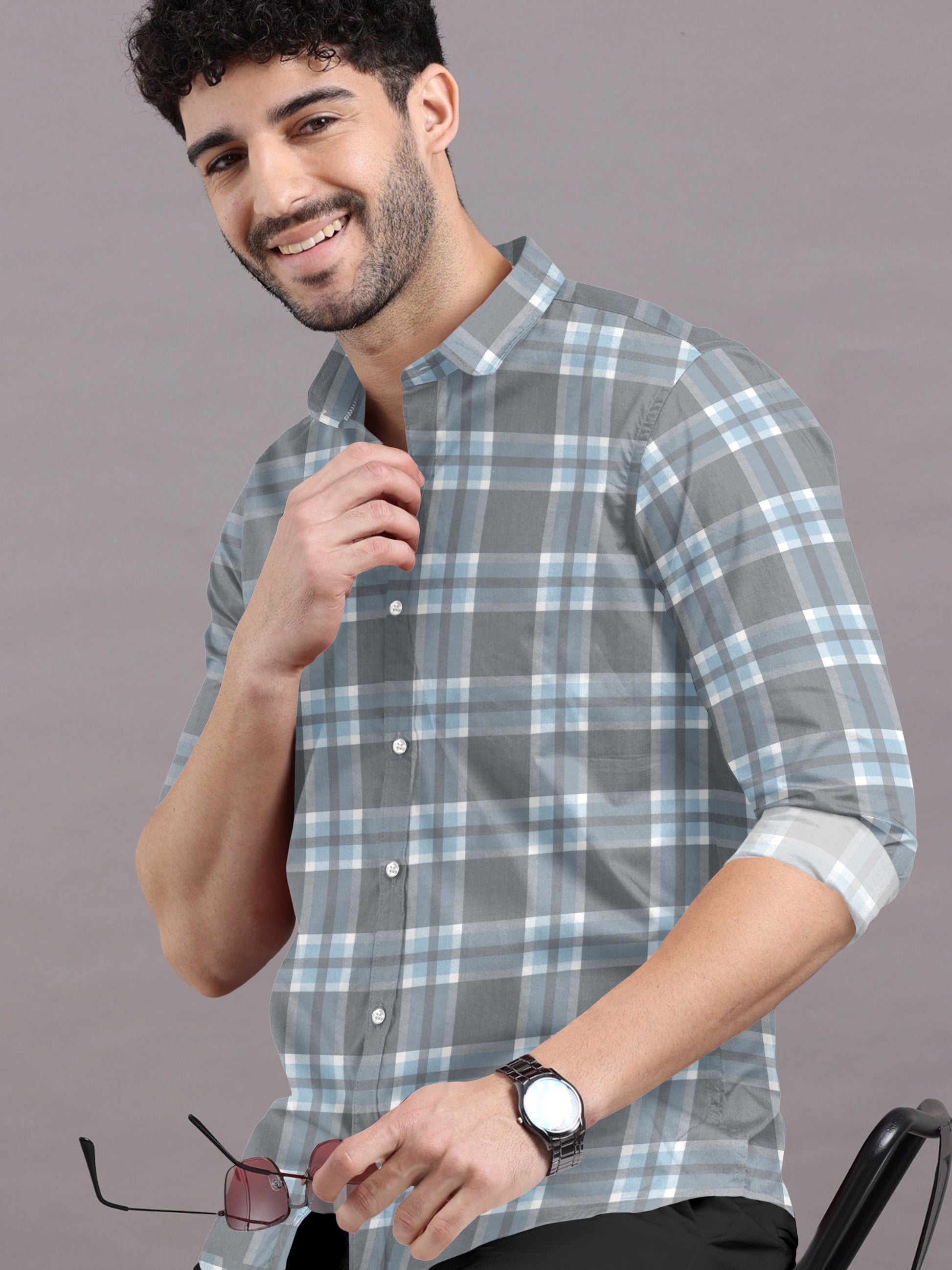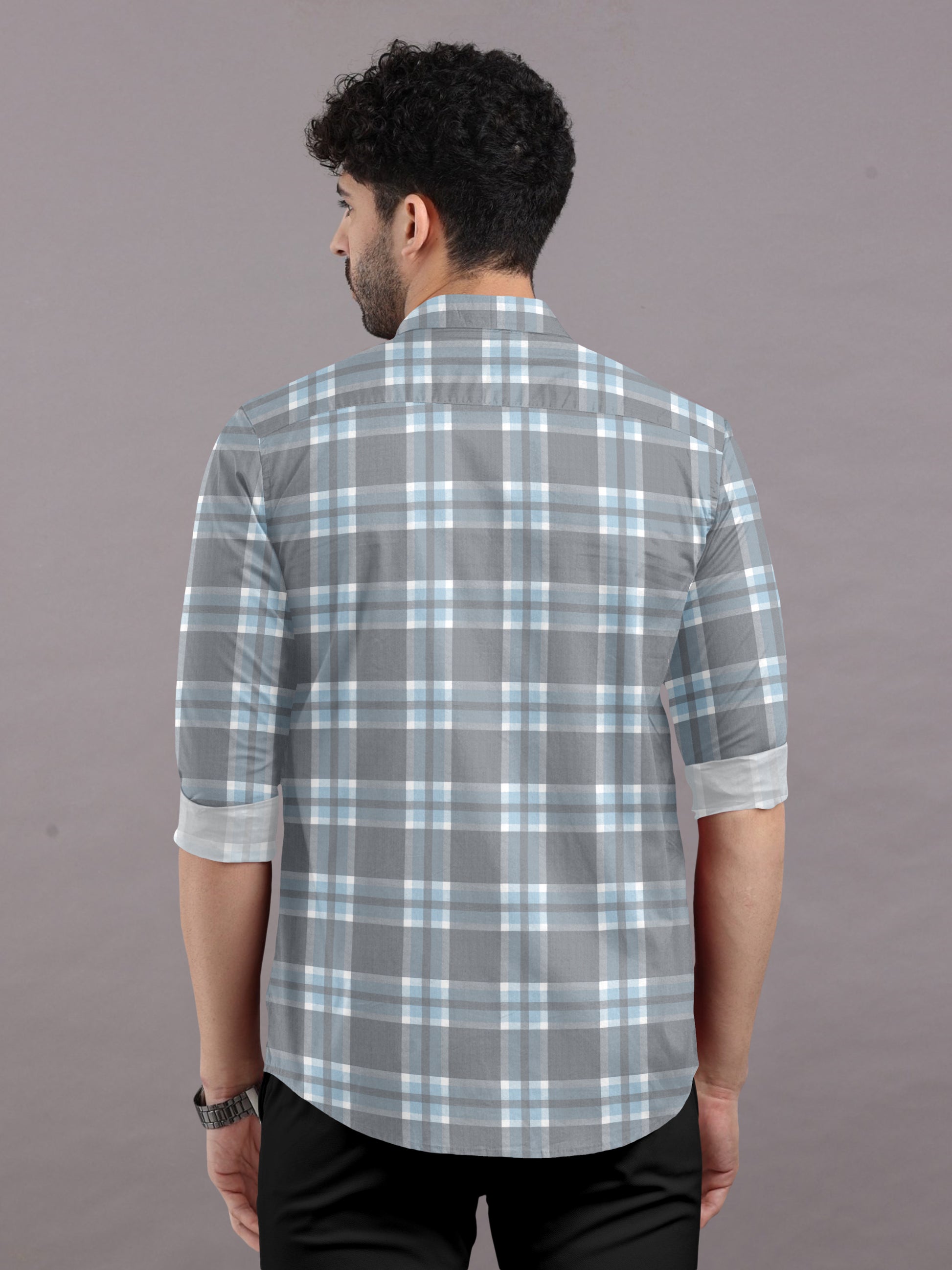 Cloudy Grey With White-Blue Checkered Cotton Shirt