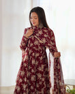 - Anarkali Fabric: Heavy pure fox georgette multi floral print. Fancy lace with V-neck churidar sleeves, zipper attached.